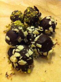 Smelt chokoladen over et vandbad og vend kuglerne i den smeltede chokolade.