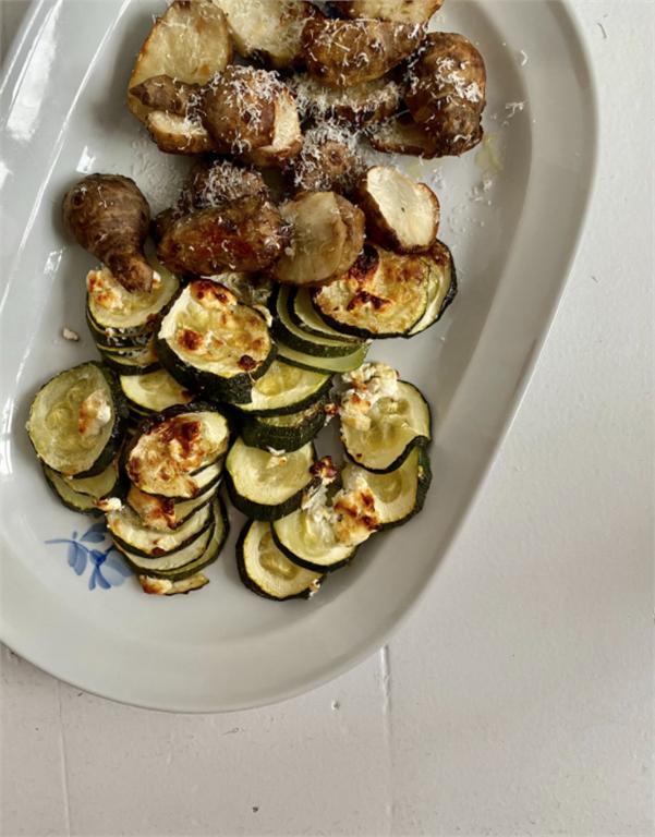 Læg skiver af squash og jordskokker på en bageplade med bagepapir.