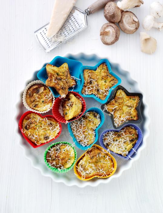 Fordel massen i muffinforme, drys med revet parmesan og bag dem ved 180 grader i 25 min.